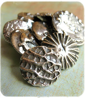 I love antiqued metal; the subtle shine, the durability, the "go with anything" aspect of it. While I was wishing to be working with copper or bronze clay, I already had a pack of fine silver precious metal clay unopened for months that I settled for. Using molds that I had made by hand, I began pressing small balls of pmc into each one, delighting in a deeply textured patty of fine silver clay. I was tired of making pendants and buttons have such versatile uses so I created simple shanks with 19 gauge wire and pressed them into the backs of the molded clay. Dried, sanded, fired and tumbled; these buttons turned out beautiful!
