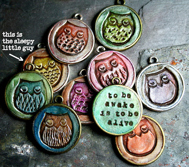 This is the October 2011 'simple truths sampler' charm. My sampler club is a small but mighty group of designers who signed up to get a limited edition charm or pendant each month. (Limited edition meaning that I won't sell this exact same design and will only make as many as there are in the club.And there are still some spaces available!) But this month, I accidentally made one extra, so if you would like a random little sleepy owlet for your very own, please answer the following question (winner will be announced on October 15th):
