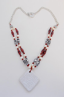 Sunday was the reveal for the "Swap and Hop" hostessed by Linda Anderson. She has the big job of pairing up partners and keeping all the behind the scene action flowing. Pretty much the only requirements are you have a blog and love handmade jewelry! I was partnered up with Jenny Kyrlach from Cincinnati, Ohio. She is a paper bead artist and made me at least 100 of them in white, black, red, blue and brown shades. I wanted her beads to be the star of my designs. These are the 2 necklaces I made and I also used the pendants, clasps and spacer beads she included. I added the waxed linen and chain from my own stash.