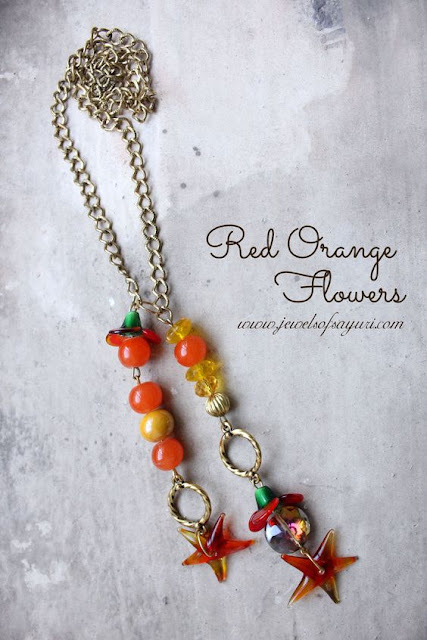 This easy-breezy lariat-style necklace is perfectly in tune with the hot summer climate where designer Divya lives. I found her process very interesting as she is teaching a class in color theory and used this to explain the analogous palette for this month's inspiration. The variation of the hues that Divya chose and the pointy-petal shape of the star-flower beads capture the dense field of wildflowers perfectly. She used some lampwork beads by Jyothi, and although I couldn't find a website for this artist, I thought they were so very intriguing and maybe we can encourage one to be created if she doesn't have a website yet! ;-)