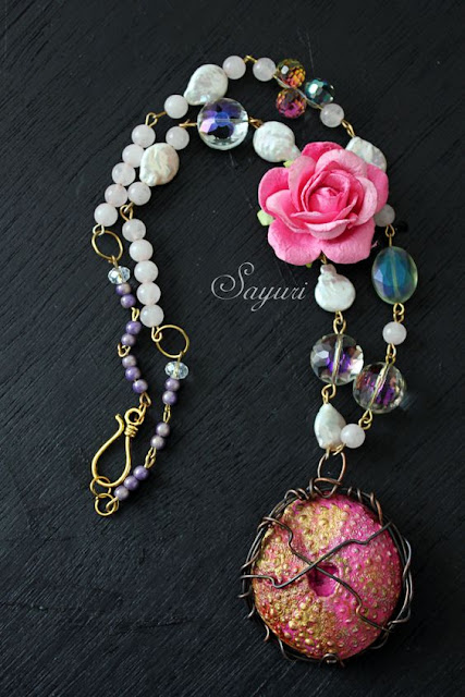 Upon first glance, the painting inspiration for February is layers of tapestries and bling with rose petals raining down from adoring maidens lining the street for this triumphant knight. And while all that is truly in this painting, there is a lot more. When you really start to look, you notice the more subtle imagery and the meaning of the title becomes more apparent. I am glad that Divya went back and really looked at the painting beyond what her first reaction was. For she discovered the message and translated that into her jewelry admirably. I think the contrast with the hard and thorny barbed wire frame holding in the softer pink and gold cabochon and the touches of crystals and the central rose make this necklace that much more intense and meaningful. In order to truly see the light you need the dark. In order to appreciate the beauty of the rose you need to respect the thorn.