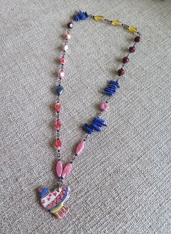 This is a fun and funky design that features a beautiful ceramic bird pendant that captures my imagination. I like making designs like this because it is a great way to use up all those leftover bits you have lying around, and the colors work with a lot of different parts of any wardrobe. The way the brilliant blue dagger beads undulate reminds me of the way the colors in Gauguin's painting seem to shimmer and move, as they would through the haze of a hot summer day.