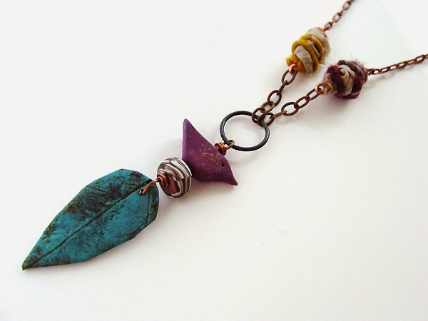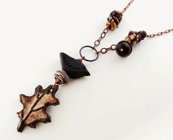 2. Attach an 8mm jump ring to the bottom of the hand-painted pendant, slide on the painted leaf pendant, small leaf charm and jump ring with the two dangles. Close the jump ring.